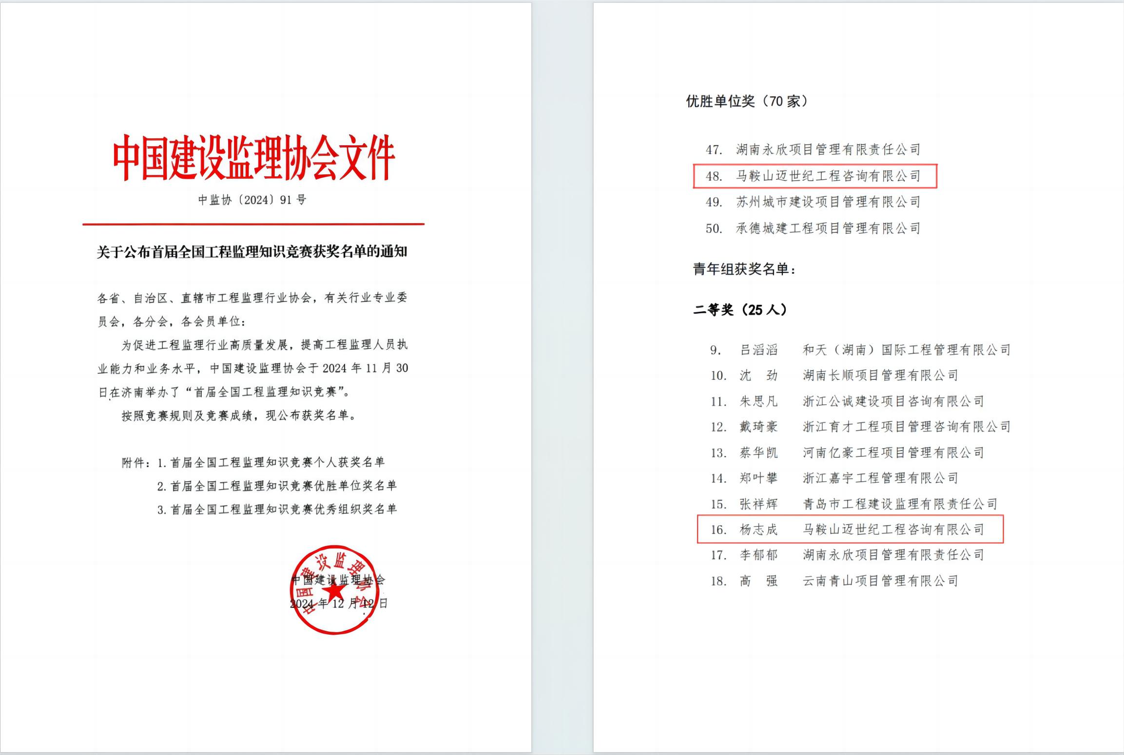 此次競賽是工程監理行業(yè)首次舉辦的全國性監理知識競賽,中冶華天高度重視,精心組織選拔、培訓,經(jīng)過(guò)市級初賽和省級決賽選拔,一批優(yōu)秀青年員工代表脫穎而出,其中,楊志成以安徽省賽區青年組一等獎的出色成績(jì)晉級全國決賽,并最終取得全國二等獎殊榮?!靶聲r(shí)代是充滿(mǎn)機遇與挑戰的時(shí)代,也是青年展現擔當和作為的時(shí)代。我將通過(guò)不斷學(xué)習和實(shí)踐,提高自身綜合素質(zhì),為公司的發(fā)展貢獻自己的一份力量?!睏钪境色@獎后表示。